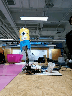 我们在小黄人的眼睛和双手的位置分别装了三个红外传感器(眼睛里的那个是不是毫无违和感呢,哈哈)。当人手靠近传感器时,传感器的信号会发生变化。Arduino控制器接收到这种变化后,会控制对应的舵机转动到相应的角度,保持一段时间后恢复原位。我们总共有两个舵机,分别控制小黄人的向后倒和左右闪躲。同时,Arduino控制器通过LM386芯片驱动扬声器,播放小黄人笑声的wav音频。