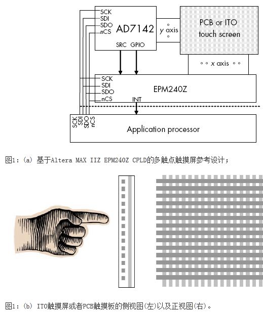 参考设计有一个简单的数据解释程序,演示并测试多触点传感器的工作。AD7142 CDC用于监测电容变化,只有14个电容传感器通道。在这一参考设计中,MAX IIZ CPLD扩展了AD7142 CDC的功能,使其能够处理两维ITO薄膜和PCB触摸传感器。应用处理器通过SPI或者I2C总线访问AD7142的CDC寄存器文件,将MAX IIZ CPLD的SRC信号控制设置在合适的轴上。长时间暂停后,触摸屏监测到一次触摸时,MAX IIZ CPLD会产生一个中断信号。