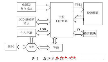 该多功能电子血压计系统的总体结构框图如图1所示,主要包括LPC3250主控模块、电源及复位模块、检测模块、LCD触摸屏模块、WiFi模块、语音模块和USB模块等6大模块。