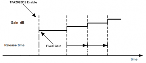 EN 和 SWS 不会清除寄存器的设定状态,所有寄存器值维持原先的设置,因此 TPA2028D1 在软件使能之后可以按照设定的 Fixed Gain和 Max Gain以及 Release Time进行变化。如 Figure 2所示。因此只需要设置合适的 Fixed Gain, Max Gain 和 Release Time,就可以控制这种变化,从而消除 AGC和DRC带来的淡入淡出问题。