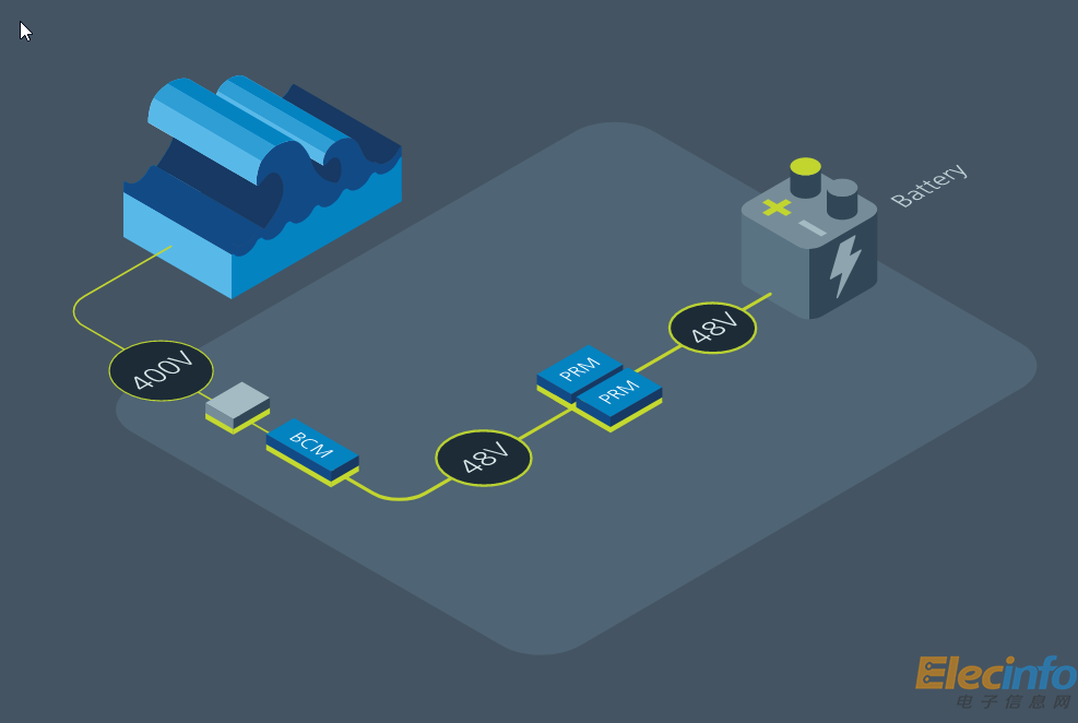 图 3 SeaRAY使用 Vicor BCM® 固定比率转换器和PRM™ 稳压器模块,及複雜的多級分立式轉換器,可高效轉換洶湧、不可預測的波浪動能並提供可受控制的平穩電源。這幫助 C-Power 將 SeaRAY 設計的轉換效率從 50% 左右提高到超過 90%.