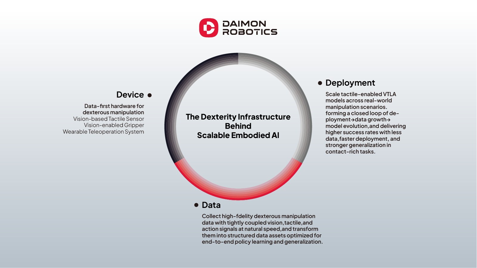戴盟机器人相关负责人表示,戴盟机器人致力于构建面向具身智能的灵巧操作基础设施,通过"3D"战略——即 Device(视触觉硬件设备)、Data(多模态交互数据)、 Deployment(场景化部署)——打造从感知到执行的完整闭环,以 DaaS(Data as a Service)和 VTLA(Vision-Tactile-Language-Action)模型驱动灵巧技能的规模化交付,让机器人真正具备可泛化的物理世界操作能力。