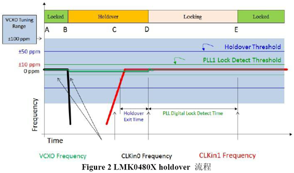 LMK0480XX 系列时钟器件的Holdover 功能是真正的hitless switch,下面的章节将详细介绍holdover 的整个过程及相关的指标。