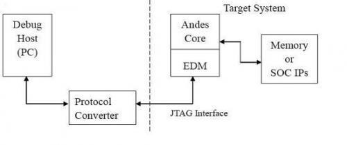 一个debug system包含一个debug host和一个target system.EDM主要的功能就是translate debug host发出的TAP指令来存取系统memory或是CPU.下图为基本的debug系统方块图。