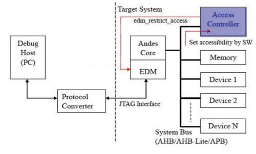 EDM安全存取是AndesCore 内建的功能(option),应用在安全存取的控管。EDM安全存取有二种的控管方式:debug access indication和EDM access restriction.第一种控管方式(debug access indication)提供了一个sideband signal用于指示从调试器(Debug host)的请求。第二种控管方式, 控制AndesCore的input port(edm_restrict_access )达到EDM存取的限制。更详细的内容在后续章节会有更深入的介绍。