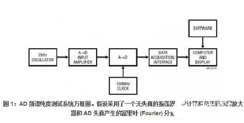 图 1 给出了系统的示意图。一个低失真振荡器通过一个放大器来驱动 AD。AD 输出接口对转换器输出进行格式化,并与负责执行频谱分析软件和显示结果数据的计算机进行通信。