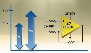 运算放大器提供 50µV 精准度和 0V 至 76V 的输入范围