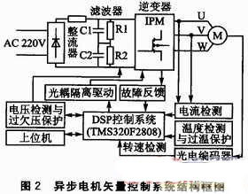 本系统采用主回路为电压型的“交-直-交”变频结构,主要由整流电路、滤波电路以及逆变电路组成。为了使主回路结构简单并且便于器件的更换和维修,本设计采用了模块化的结构设计方案。图2为基于TMS320F2808的异步电机矢量控制系统的结构框图。