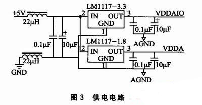 图3为供电电路。为了提高控制系统的稳定性和延长器件的使用寿命,本设计采用高性能稳压芯片、低压差电压调节器LM1117,为TMS 320F2808提供可靠的供电电源。分别选用3.3 V和1.8 V的固定电压输出芯片为DSP供电,其输出电流可达800 mA,输出电压的精度在±1%以内,并具有电流限制和热保护功能。