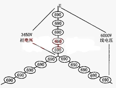单元串联多电平PWM电压源型变频器,采用若干个低压PWM变频功率单元串联的方式实现直接高压输出,该变频器对电网谐波污染小,谐波输入电流很低,输入功率因数高,不必采用输入谐波滤波器和功率因数补偿装置。如以6kV的输出电压等级为例(如图2),电网电压经过二次侧多重化的隔离变压器降压后向功率单元供电,功率单元为三相输入、单相输出的交一直一交PWM电源型逆变器结构。将相邻功率单元的输出端串接起来,形成Y联结构,实现变压变频的高压直接输出,供给高压电动机。