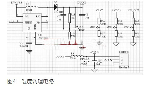 本文采用的湿度传感器是Honeywell公司生产的HIH-4000。这是具有激光调整互换型容性变化的单片集成电路,其输出电压与RH值呈线性关系,精度高,响应时间快,漂移小, 典型工作电流仅为200mA,令HIH-4000 系列非常适合低功耗,电池工作的系统。在标准工作电压(DC5V)和标准室温(25℃)下,随着RH值从0%到100%,对应的输出电压从0.96V到3.90V。本记录仪使用单节锂电池供电,而HIH-4000最佳工作电压是5V,因此采用AIC1896进行升压。使用AD通道1测量HIH-4000的工作电压,AD通道2测量湿度输出电压,因为AD的参考电压是1.26V,所以需要用300kΩ和100kΩ电阻进行分压。湿度调理电路如图4所示。